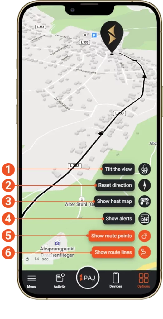 Com as opções de exibição , você pode mostrar radares de velocidade , pausar sinais do localizador ou disparar alarmes no mapa .